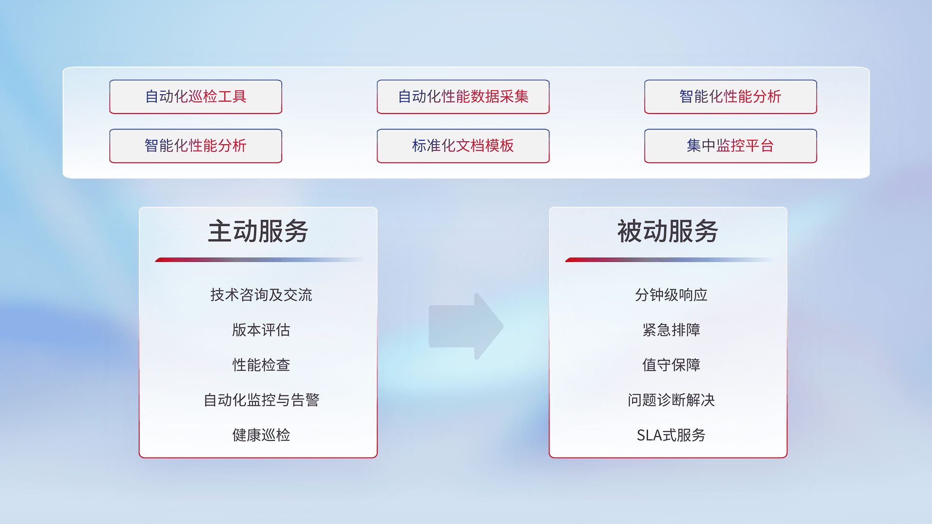 智能化工具和标准化文档,,,,保障服务质量,,,,提供主动服务(包含技术咨询、、、、版本评估、、、、性能检查、、、、自动化监控与告警、、、、健康巡检)和被动服务包含(分钟级响应、、、、紧急排障、、、值守保障、、、、问题诊断解决、、、、SLA服务)。。。。